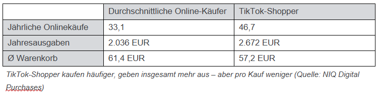 Auch beim Einkaufsvolumen liegen sie vorn. Während die durchschnittliche Onlinekundschaft jährlich rund 2.036 Euro ausgibt, kommen TikTok-Shopper auf 2.672 Euro – ein Plus von rund 30 Prozent. Der einzelne Warenkorb fällt dagegen kleiner aus: 57 Euro pro Bestellung bei TikTok-Shoppern gegenüber 61 Euro im Durchschnitt.