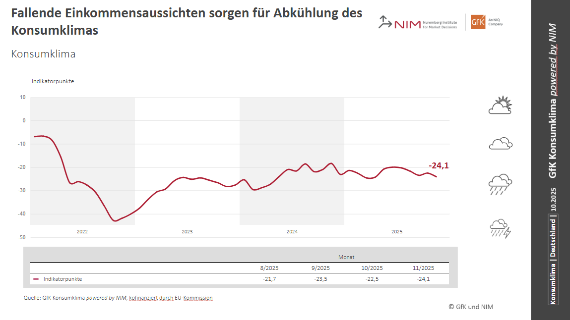 Nürnberg, 28. Oktober 2025 – Das Konsumklima setzt seinen Abwärtstrend fort. Hierfür sind die im Oktober deutlich getrübten Einkommenserwartungen der deutschen Verbraucher verantwortlich. Im Gegensatz dazu zeigen sowohl die Konjunkturerwartungen als auch die Anschaffungsneigung leichte Zuwächse. Und die Sparneigung bleibt – wie bereits im Vormonat – nahezu unverändert. Folglich prognostiziert der Konsumklima-Indikator für November 2025 im Vergleich zum Vormonat (revidiert -22,5 Zähler) einen Rückgang um 1,6 Zähler auf -24,1 Punkte. Dies zeigen die aktuellen Ergebnisse des GfK Konsumklimas powered by NIM, das seit Oktober 2023 gemeinsam von NIQ/GfK und dem Nürnberg Institut für Marktentscheidungen (NIM), Gründer der GfK, herausgegeben wird.