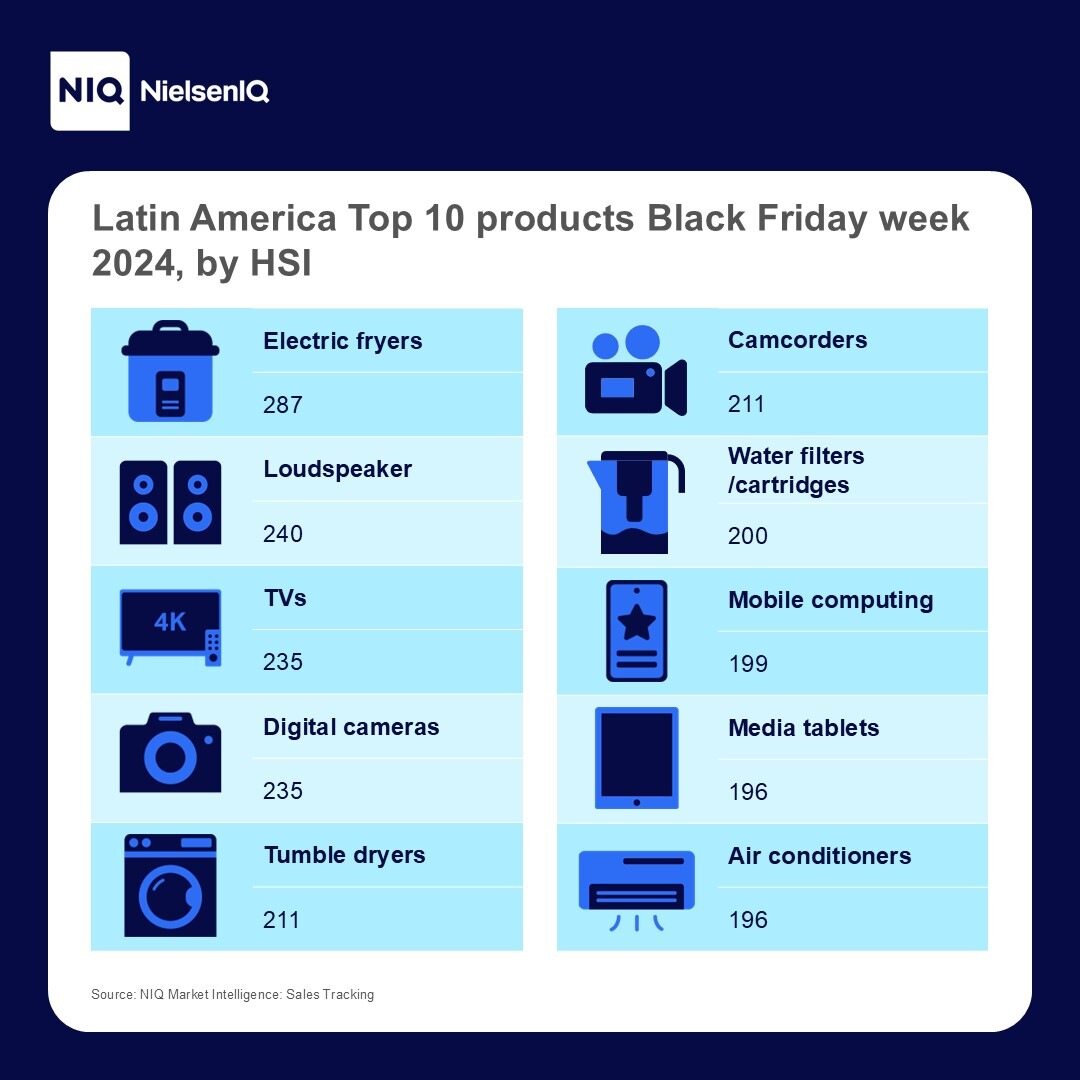 - Top products in LATAM in 2024 included electric fryers (mostly air fryers), loudspeakers, TVs, digital cameras, tumble dryers, and air conditioners.