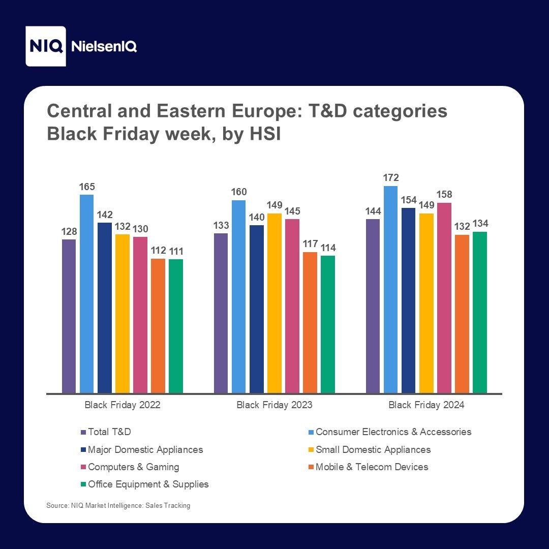 In our analysis, we looked at T&D sales for the week of Black Friday in 2022, 2023, and 2024. Even though Black Friday isn’t a major event in all regions, in aggregate, HSI for all categories of T&D has shown a steady rise: Between 2022 and 2024, the HSI for T&D increased 11.7%—underscoring growing Black Friday consumer trends.