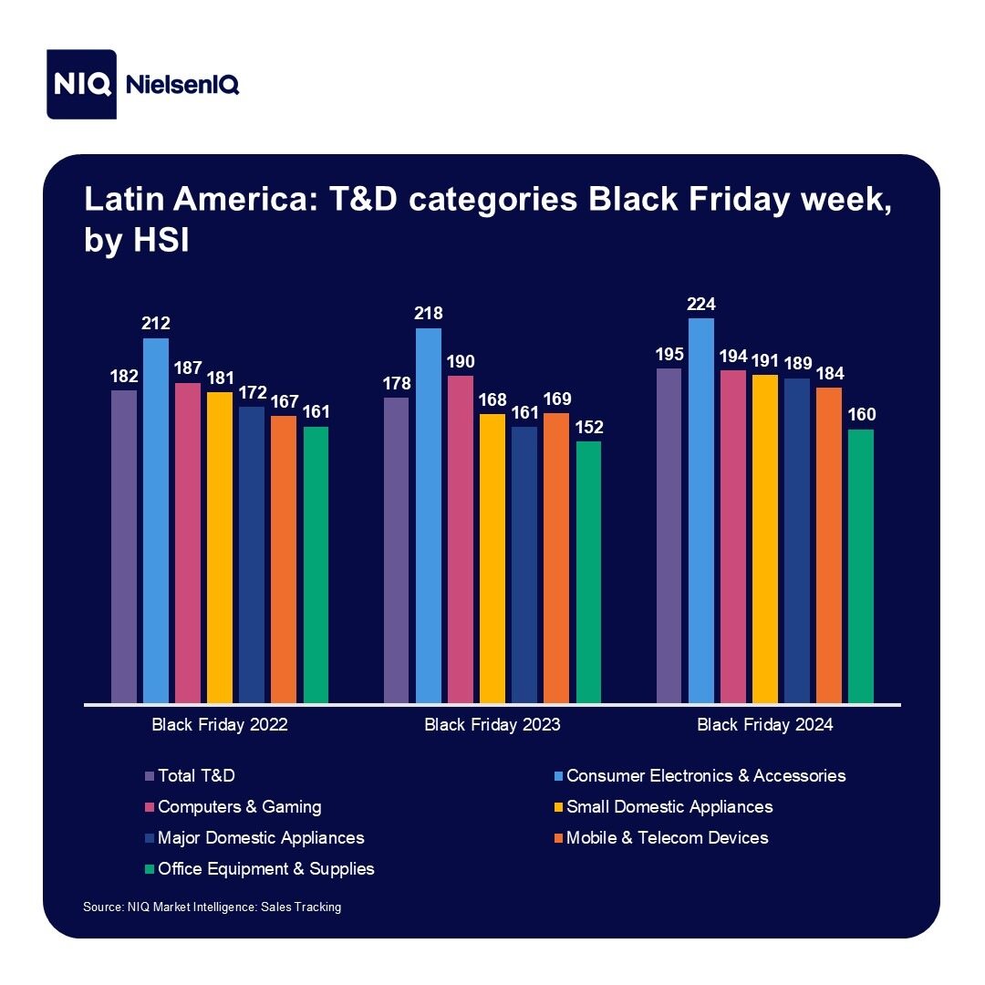 HSI values dipped in most T&D categories between 2022 and 2023 but recovered in 2024 as inflation cooled in the region. In 2024, this group had the highest HSI for total T&D sales (195), as well as the highest average for all three years (185), underscoring strong Black Friday buying trends.