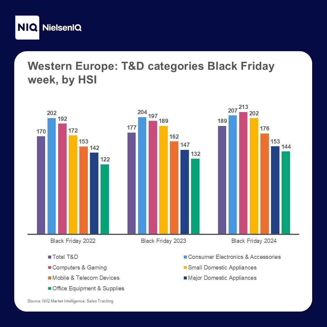This region recorded steady year-on-year growth for Black Friday and had the second-highest HSI average for total T&D over three years (179). We included 15 Western European countries in our analysis.