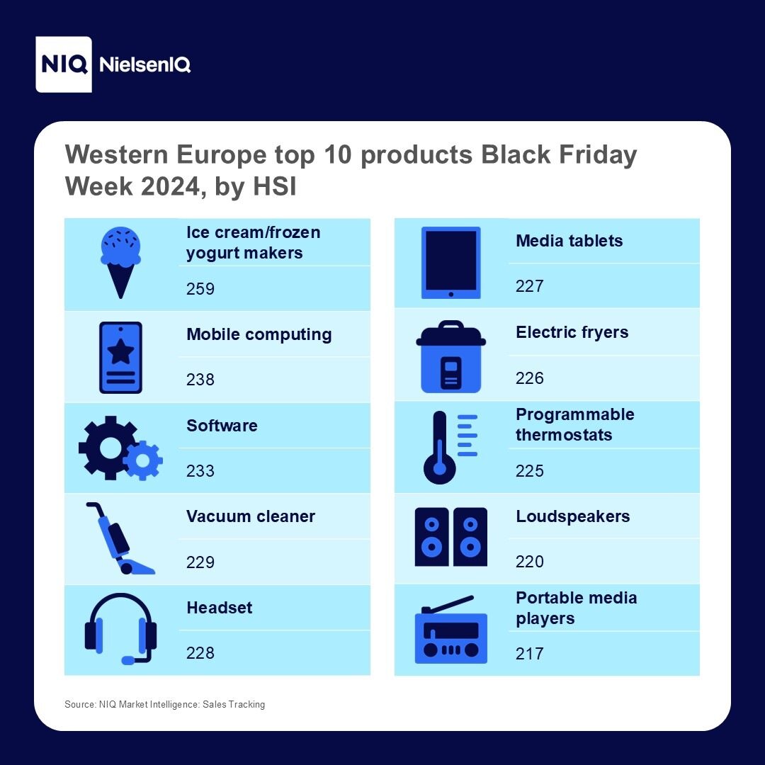 - Iced desserts/Yogurt makers (259) were popular for Black Friday in 2024. Hot summers and rising demand for healthy, low-fat, and probiotic treats have made these appliances more popular.