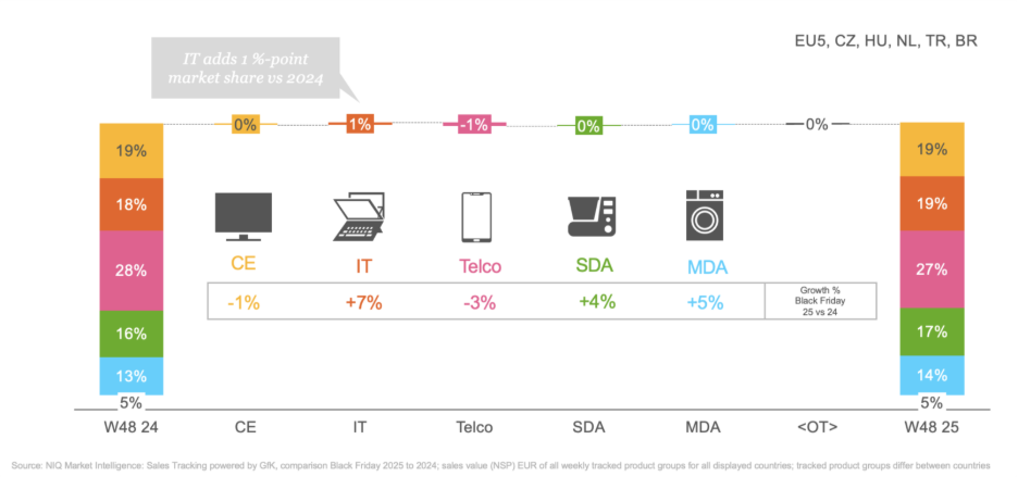 Sector performance varied significantly across categories. Telecom remains the largest contributor to Black Friday revenues, accounting for 28% of total T&D sales, but it declined year-on-year due to weaker premium smartphone demand. IT categories, representing about 18% of the market, posted the strongest growth, narrowing the gap with Consumer Electronics (CE), which holds 19% share.