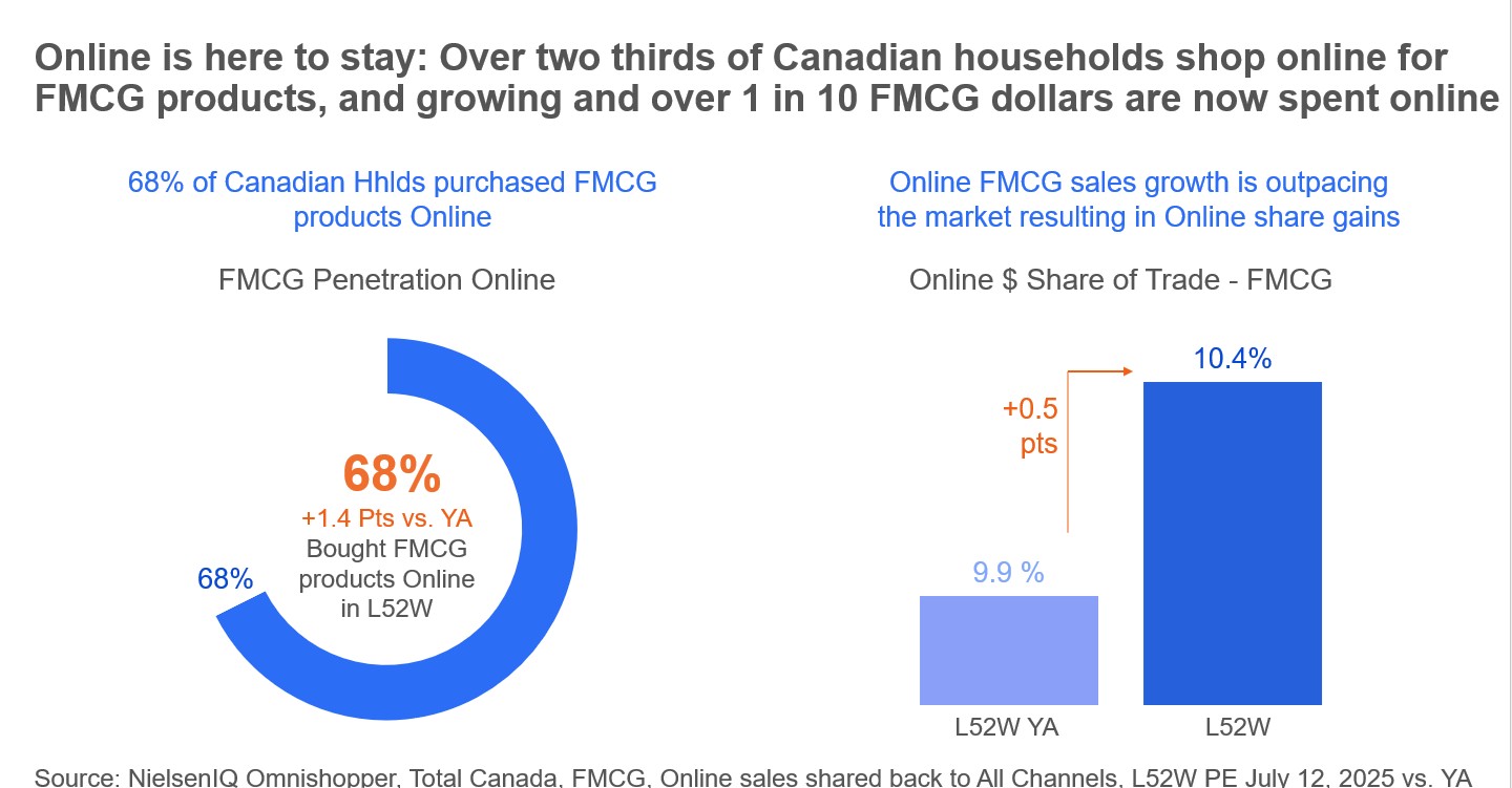 - Omnishopper Dominance: 68% of Canadian households purchase FMCG online