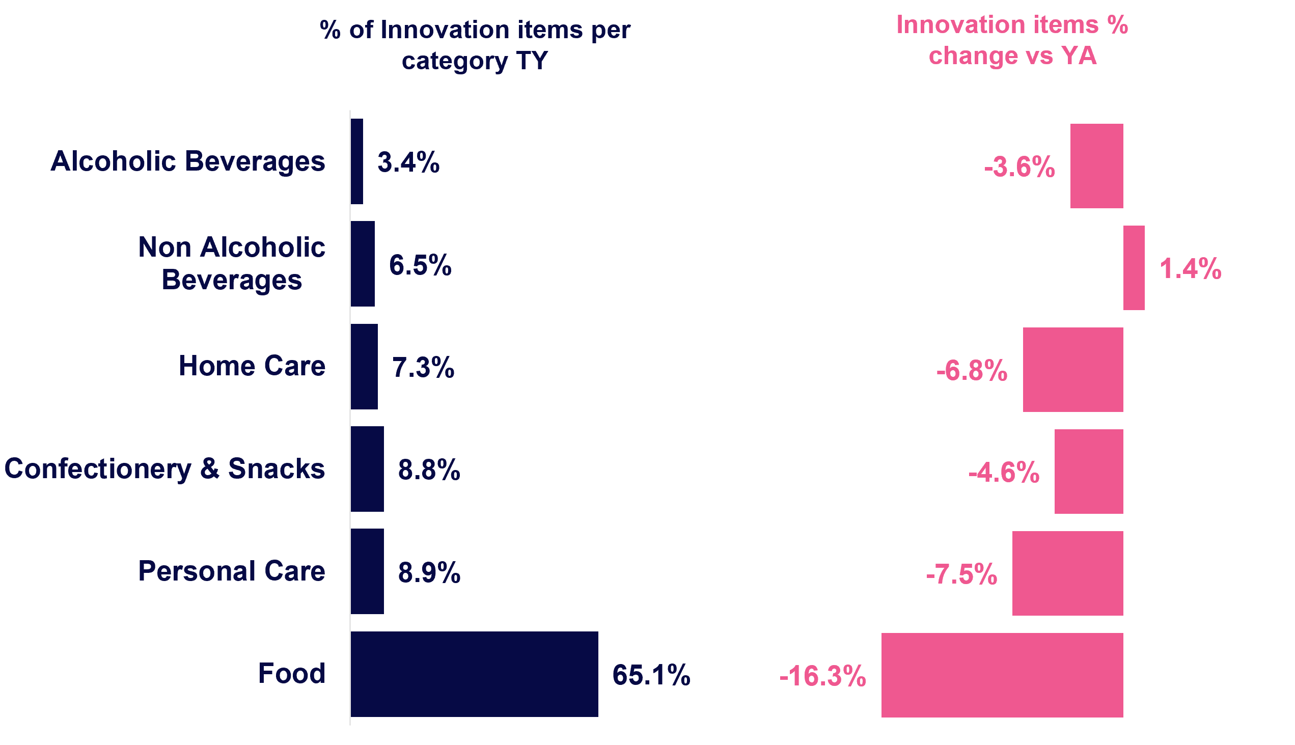 Most of the innovation items in 2025 were within Food categories, but experienced double-digit decline compared to 2024