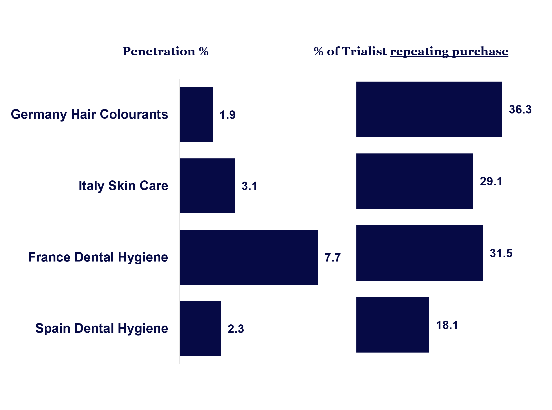 A higher proportion of Italian and German trialists are re-purchasing new products after their first trial