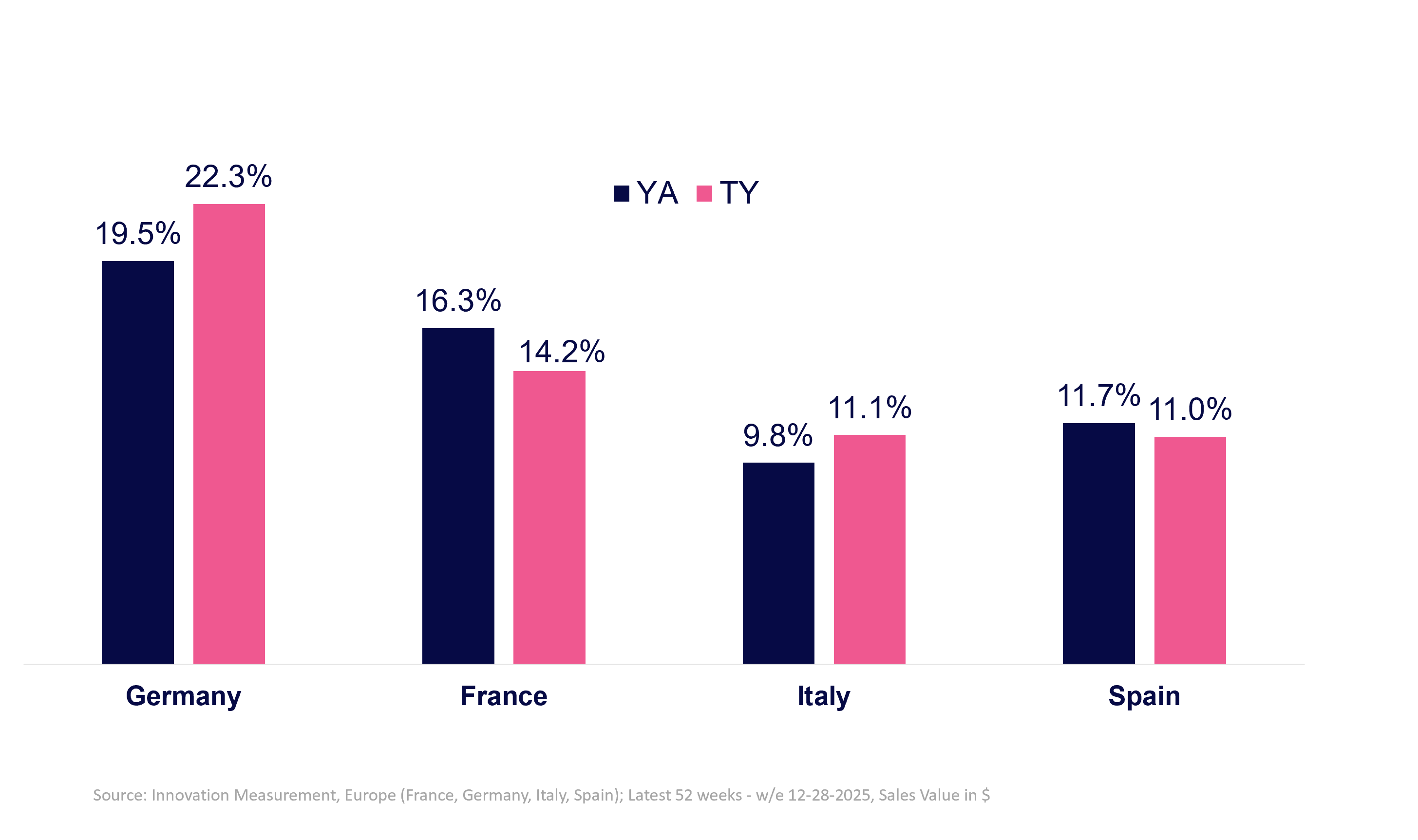 Source: BASES Innovation Measurement, Europe (France, Germany, Italy, Spain); Latest 52 weeks until January 22nd 2026; Total number of innovations by brand owner (product x country counts)