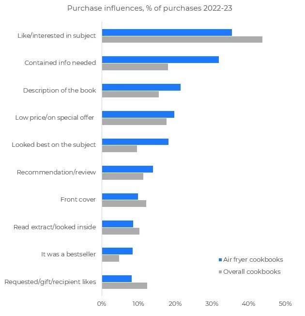 And with so many cookbooks promising to save time and energy, how are buyers finding and choosing their air fryer books? Discovery is very online so far, with 30% found via browsing online booksellers, and 15% browsing general search engines. When deciding what book to purchase, content is key: subject ranks as the highest influence, although less so than overall cookbooks, with contained information needed and best on subject especially more likely to sway buyers compared to the wider cookery market, alongside the blurb and low prices within the top five.