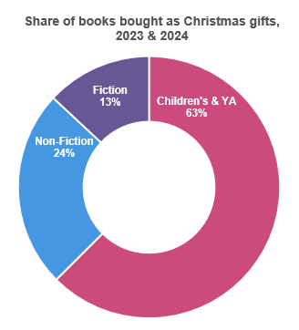 Christmas is nearly upon us, so we’re in prime shopping season for books: nearly a quarter of print book purchases in the UK stem from the last eight weeks of the year, as measured through BookScan. Of course, not all of those will be Christmas gifts; according to our monthly Books & Consumers survey, only about a fifth of print books bought in November and December the last two years were Christmas gifts. Looking at the full year, 5% of book purchases across all formats were intended as Christmas gifts in 2023 and 2024, adding up to about 37m books.