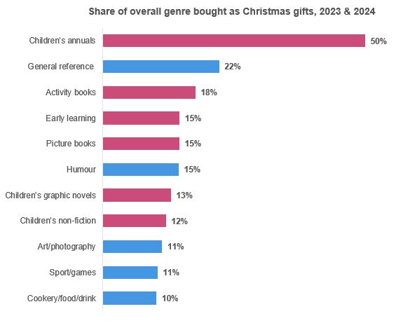 Certain genres are more dependent on the gifting season as well; above I mentioned what the top gifting genres were, but if look at that from a different angle, we can see which areas have the highest share of their purchases coming from Christmas. The very clear winner is children’s annuals, with half of those bought from 2023 to 2024 intended as Christmas gifts. Next in the list is somewhat related, with general reference the home to Guinness World Records, an annual festive bestseller. Eleven genres have at least 10% of their purchases come from Christmas gifts for these years, shown in the graph below, split across children’s (pink) and non-fiction (blue).