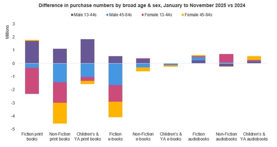 Countering the female consumers in this age range, men under 45 were buying fewer non-fiction audiobooks in 2025, with signs of their interests shifting to other formats and sectors. Their purchases of print books across fiction, non-fiction and children’s & YA, as well as e-books for fiction and non-fiction, all increased, in most cases the only broad group to be buying more, with the difference in purchases year-on-year for each sector shown in the graph below. Despite these shifts, women aged 13-44 remain the most prominent group, at 35% of overall book purchases in 2025, followed by 27% for their male counterparts, who are still the largest non-fiction consumers.