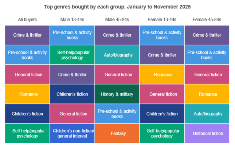 Across these featured genres, overall purchases to November had increased for pre-school & activity books, general fiction, fantasy and self-help/popular psychology, although of course there are many other areas of the market to be explored. For a more in-depth presentation, join us for The UK Book Consumer 2025 on 26 March 2026, either in person at the London Transport Museum or virtually from wherever you may be. Contact infobookresearch@nielseniq.com to book your place!