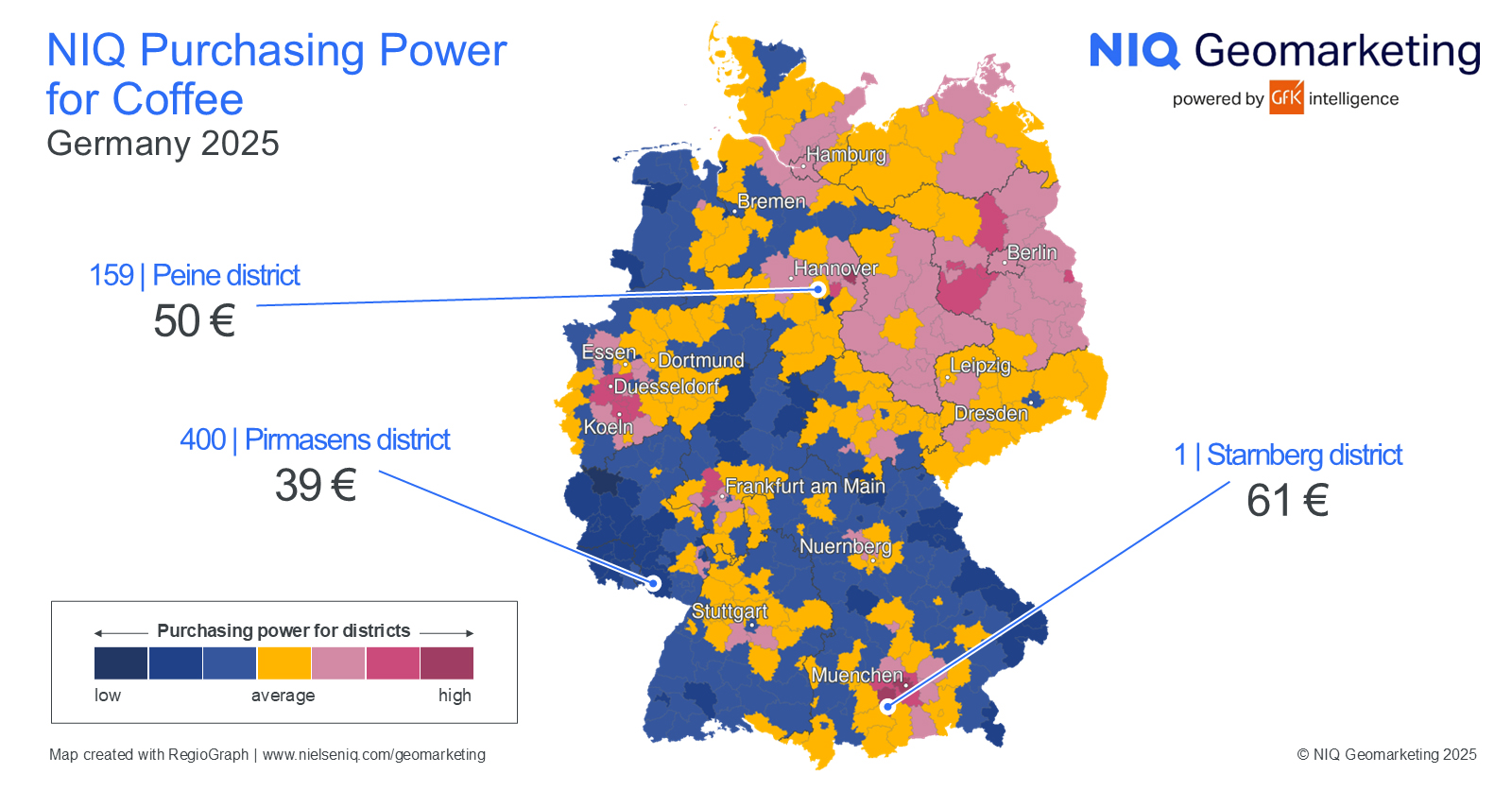 Our Geomarketing Map of the Month for December shows the regional distribution of purchasing power for coffee in Germany in 2025.