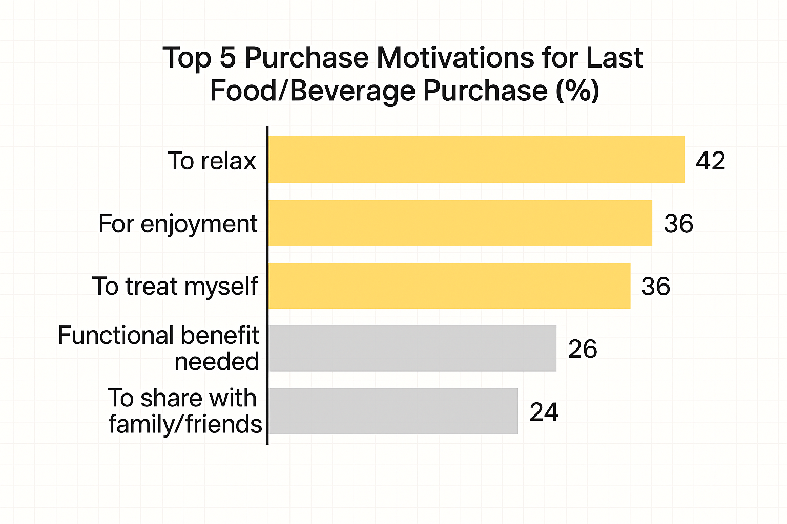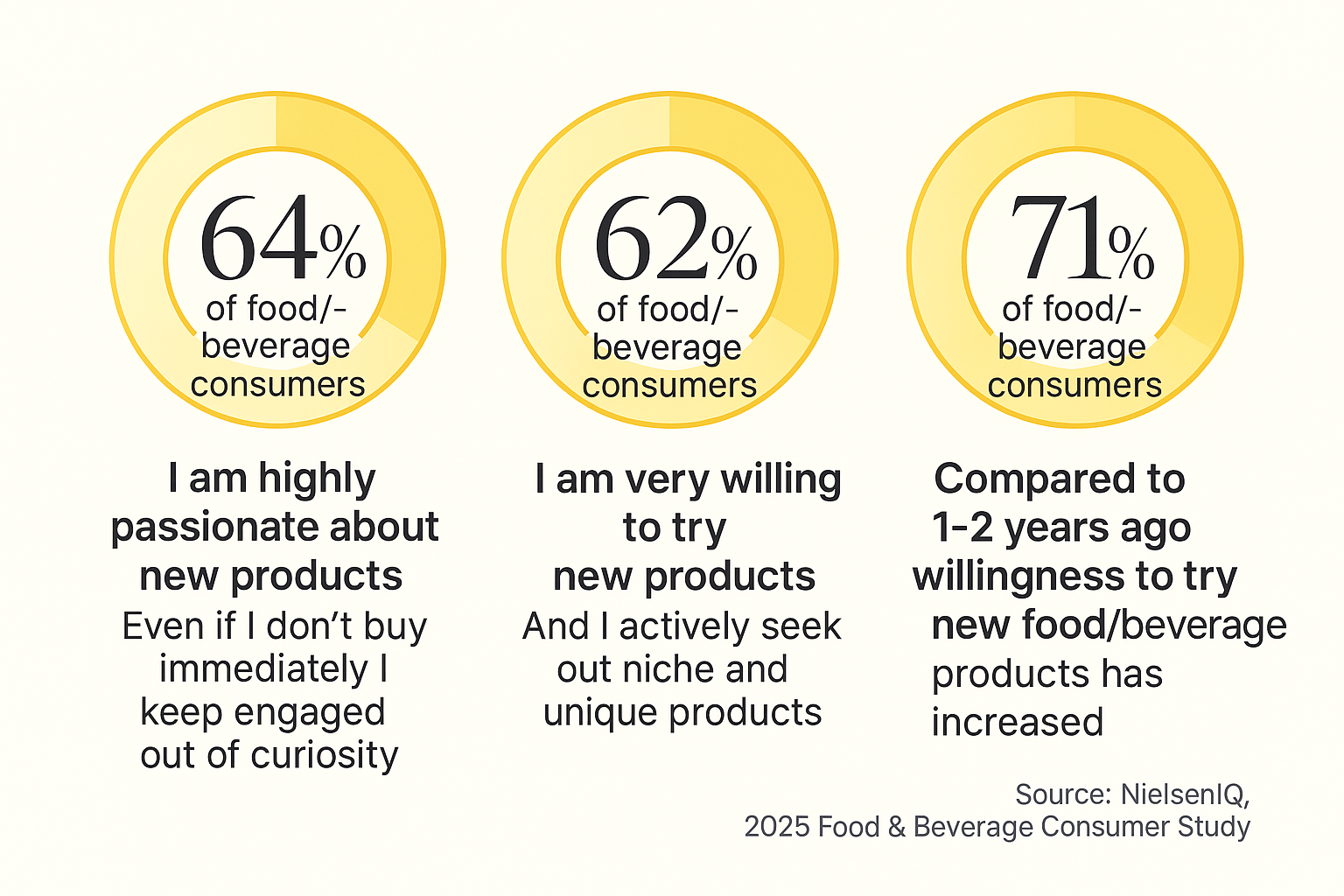 F&B consumption is also extending into content-rich experiences and social value, serving as “visible lifestyle statements” and “recognizable emotional signals.” NielsenIQ’s 2025 survey found that 65% of consumers are willing to engage with and co-create new F&B products on social platforms, while 26% buy novelties specifically to share within their social circles.