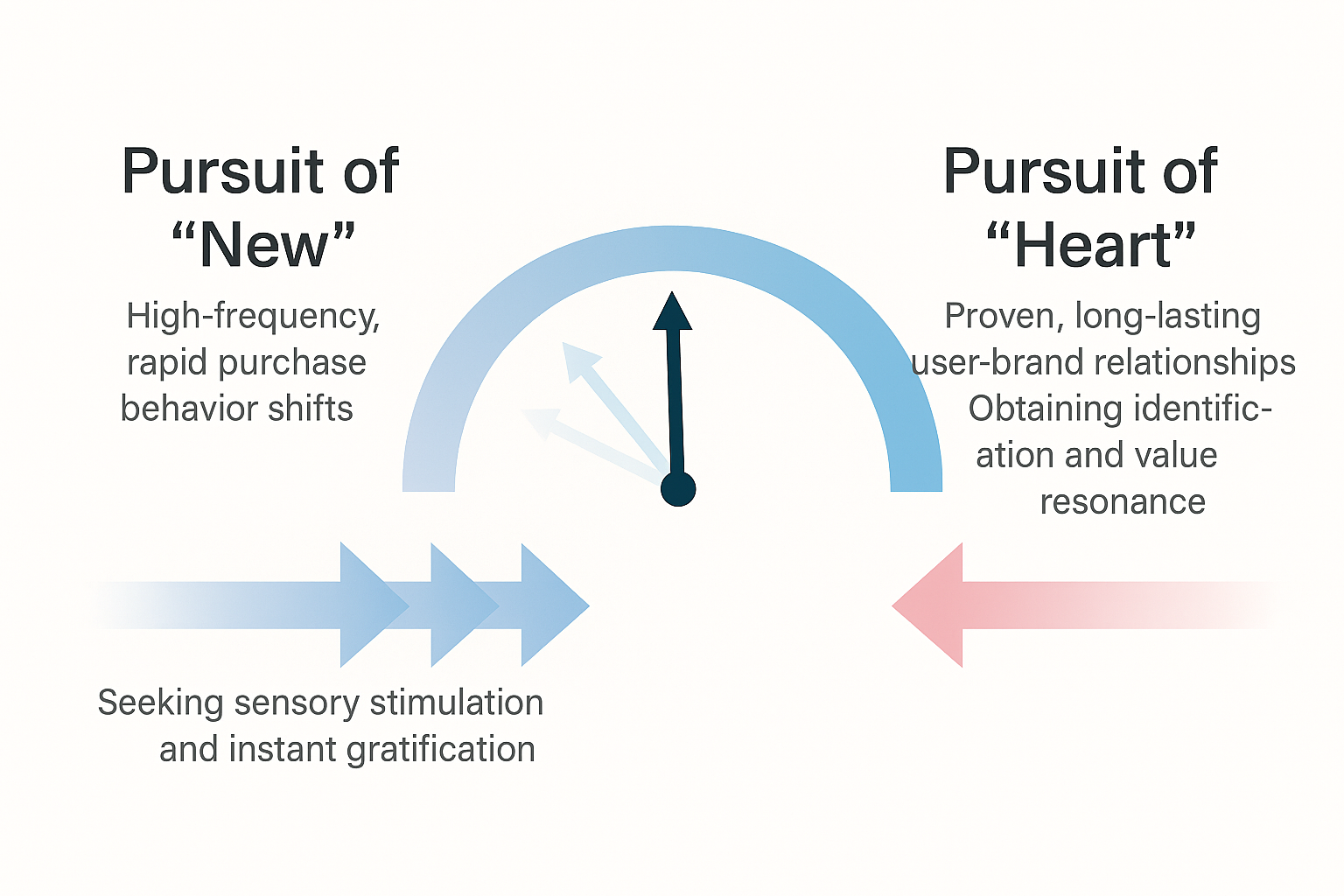 With decision-making pathways compressed, consumers now front-load steps like information gathering and brand evaluation, using content to instantly validate choices. This “confirmation-driven consumption” reflects two mindsets—“chasing novelty” (craving the new) and “chasing resonance” (valuing premium identity)—which in turn define two brand archetypes.