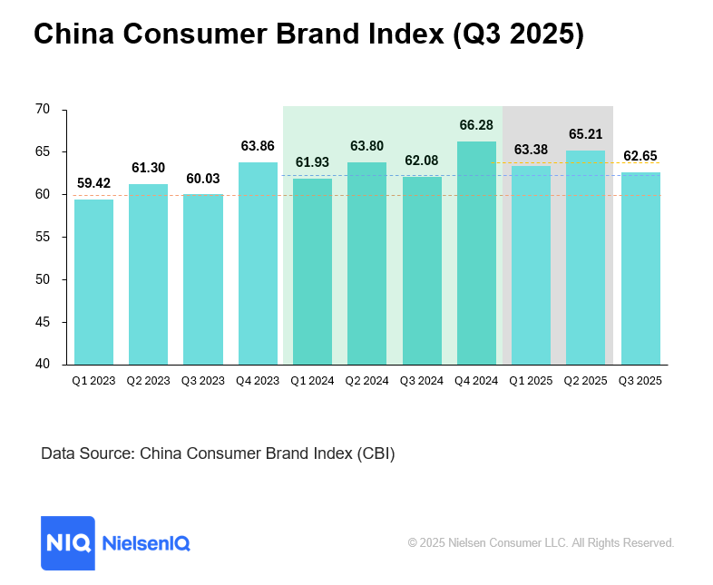Recently, the National School of Development at Peking University released the China Online Consumer Brand Index (CBI), and NielsenIQ’s latest retail research shows that in Q3 2025, the CBI rose 4.4% compared to the same period in 2023, and 0.9% year-on-year. This shift indicates that Chinese consumers’ willingness to purchase branded products continues to strengthen even outside major promotional cycles. Changes in related brand metrics also provide important insights for observing off-peak brand management strategies.