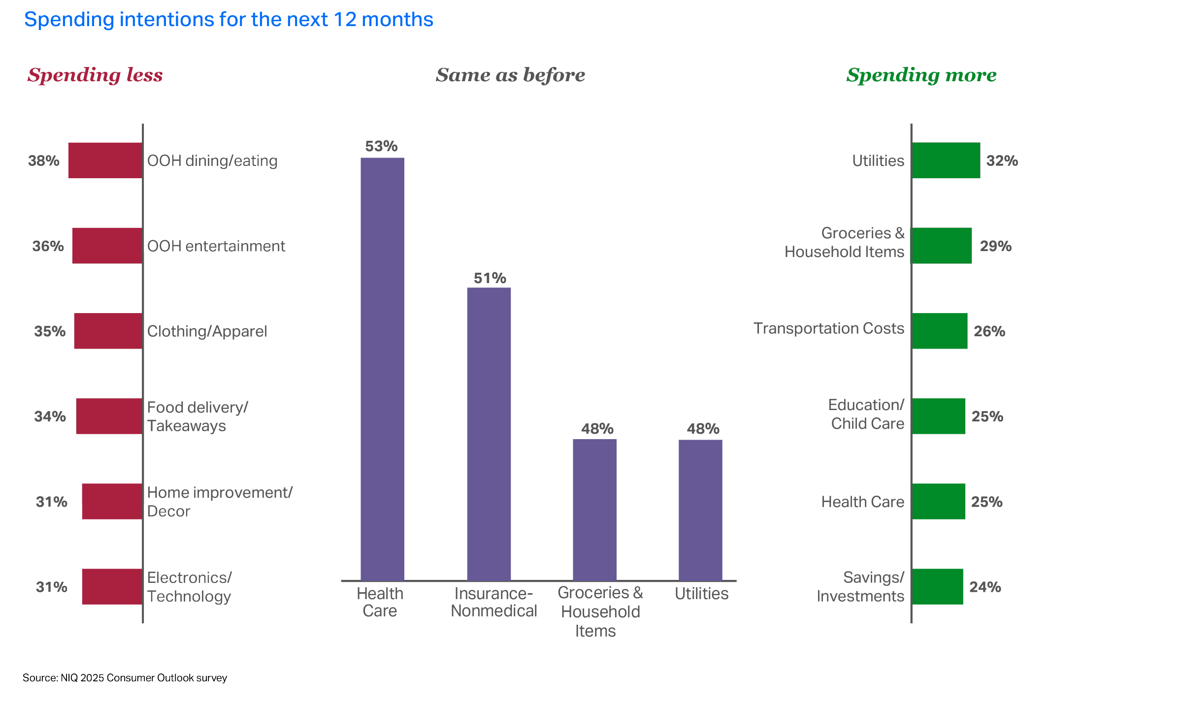 We found, for example, that global consumers will continue to spend less on eating out, entertainment outside the home, and food delivery—mirroring their behavior going into 2025. However, they plan to maintain similar spending on insurance, health care, in-home entertainment, and housing, which sends a clear signal to manufacturers and retailers that they shouldn’t expect growth to come from discretionary funds previously spent on essential (i.e., core life) expenses.