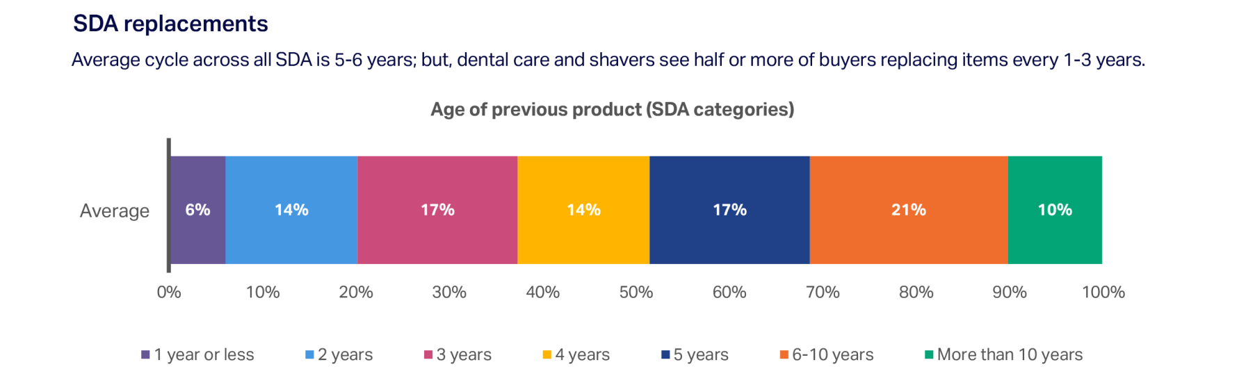 For major domestic appliances, the average replacement cycle is eight to 12 years, so peak replacements (following pandemic-era purchase spikes) aren’t expected before 2028. MDA purchase activity in 2026 will instead be driven by people replacing faulty products and by first-time buyers.