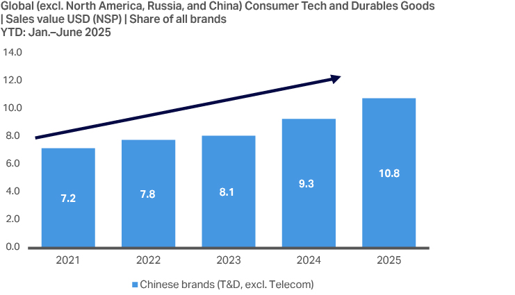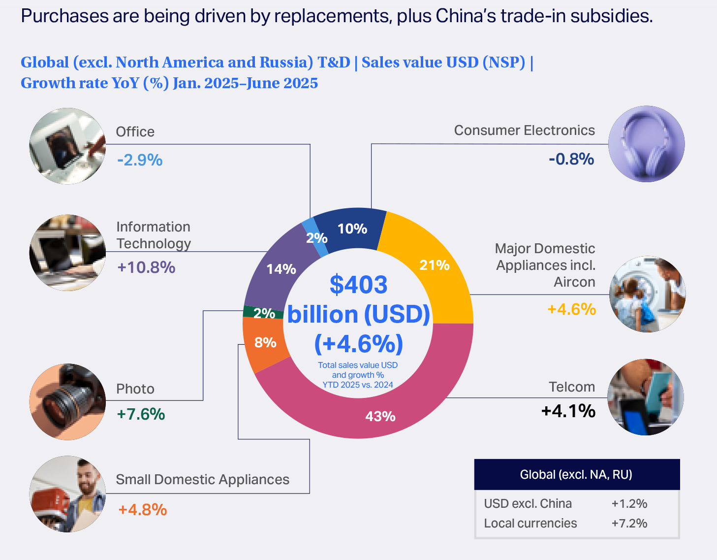 Nevertheless, in the first half of 2025 (H1 2025), sales of Consumer Technology and Durable Goods (T&D) grew 4.6% in value year over year. That increase—to $403 billion (US dollars)—was largely driven by activity in China due to retail “trade-in” policies that cut replacement costs for consumers in key product groups. With China removed from the analysis, global sales increased by a more gradual 1.2%.