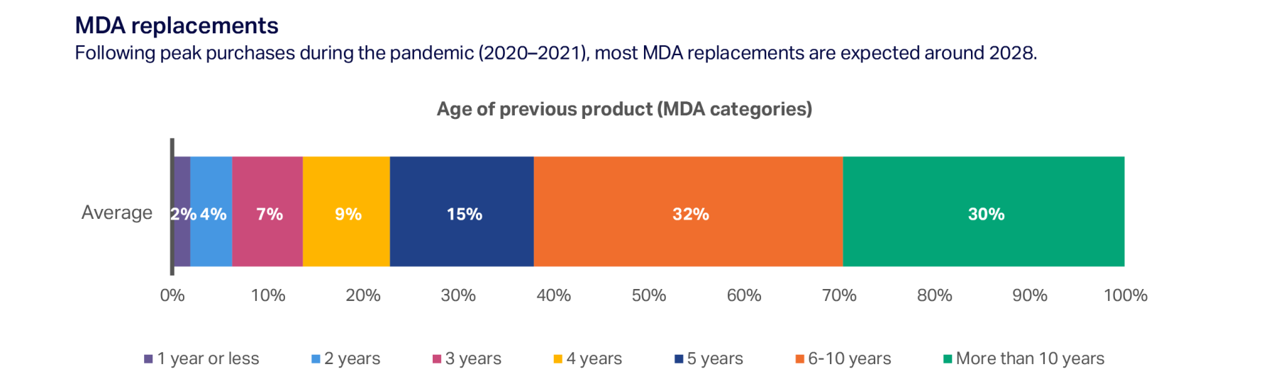 - Globally, consumer replacement cycles won’t kick in until at least 2028 for most MDA. However, SDA sales will continue to experience an uplift, driven by commoditization of innovative features.