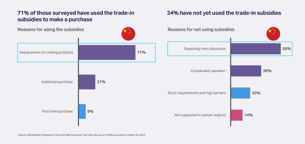 “Within China, awareness and take-up of the trade-in program is high, with the majority using it to replace existing products. However, one-third of those we surveyed have not yet made use of the program—either finding the process too complicated or hoping for greater discounts later in the year.”
