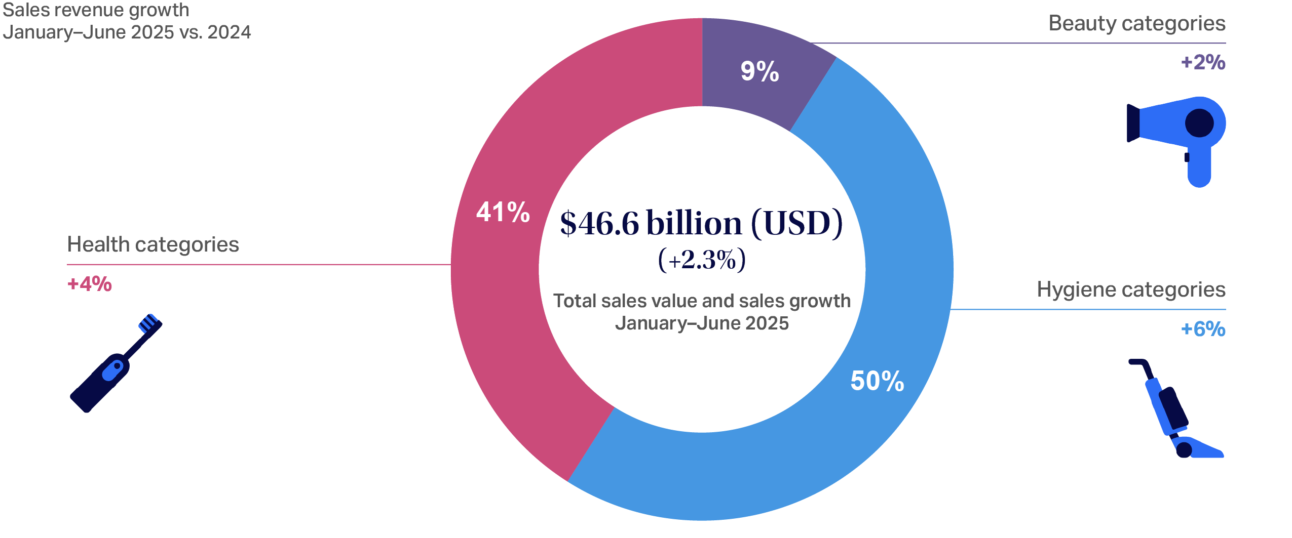 Nevertheless, in the first half of 2025 (H1 2025), sales of Consumer Technology and Durable Goods (T&D) grew 4.6% in value year over year. That increase—to $403 billion (US dollars)—was largely driven by activity in China due to retail “trade-in” policies that cut replacement costs for consumers in key product groups. With China removed from the analysis, global sales increased by a more gradual 1.2%.