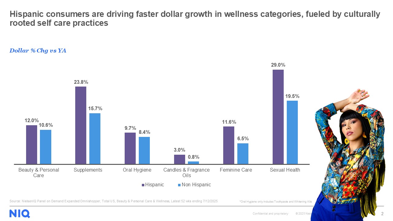 Hispanic beauty consumers are leading the wellness wave, driving double-digit growth in supplements, oral hygiene, and feminine care categories.