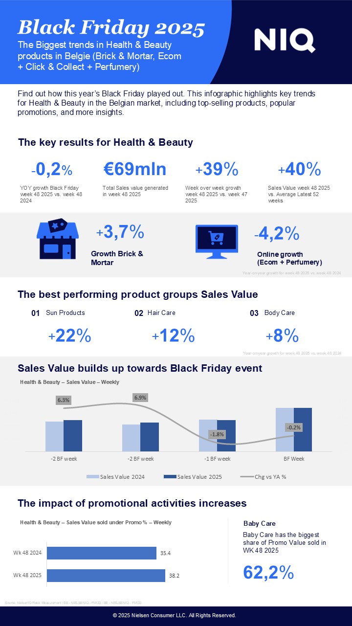 Beauty took center stage this Black Friday, with Belgian consumers driving a remarkable surge in Health & Beauty sales. The category recorded a 39% year-over-year growth, generating an impressive €69 million in sales during Week 48. Online channels, including e-commerce and perfumery, saw strong momentum, while brick-and-mortar stores also contributed significantly. Sun products led the pack with a +22.6% increase, followed by body care and hair care, highlighting a growing focus on self-care and seasonal essentials. Promotional activities played a key role, with nearly 38% of sales value coming from discounted items, making beauty one of the most dynamic segments of this year’s Black Friday.