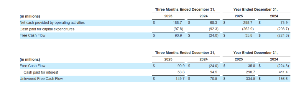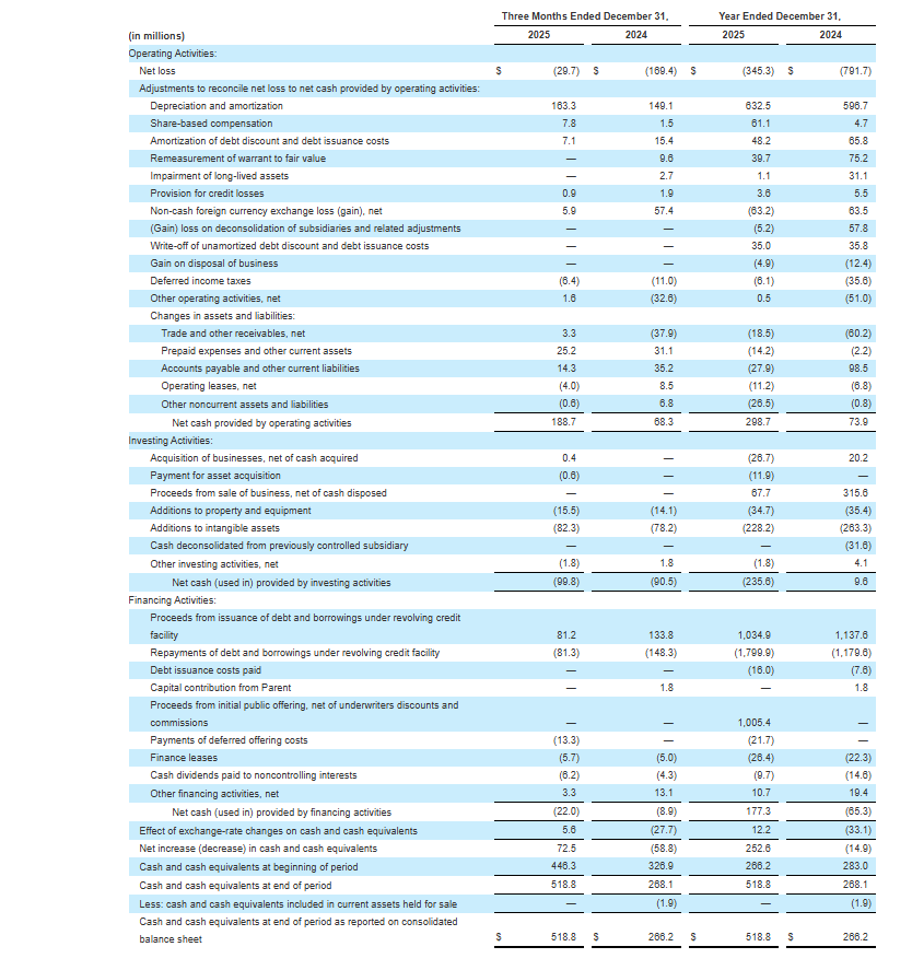 Free Cash Flow increased by $114.9 million and increased by $260.6 million for the three and twelve months ended December 31, 2025, as compared to the three and twelve months ended December 31, 2024 due to improved profitability as evidenced by a higher Adjusted EBITDA, lower transformation costs, lower additions to intangibles, and lower cash paid for interest from post-IPO refinancing. See the “Consolidated Statements of Cash Flows” in the unaudited consolidated financial statements for additional information.