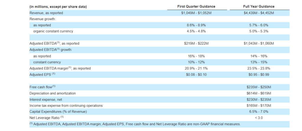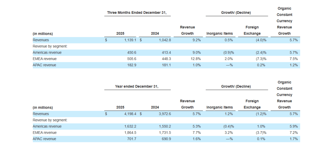 - Total revenue grew 5.7% year-over-year to $4,198.4 million. Organic constant currency revenue grew 5.7%. Revenue growth was led by EMEA and Americas, which grew 7.2% and 5.9% respectively.