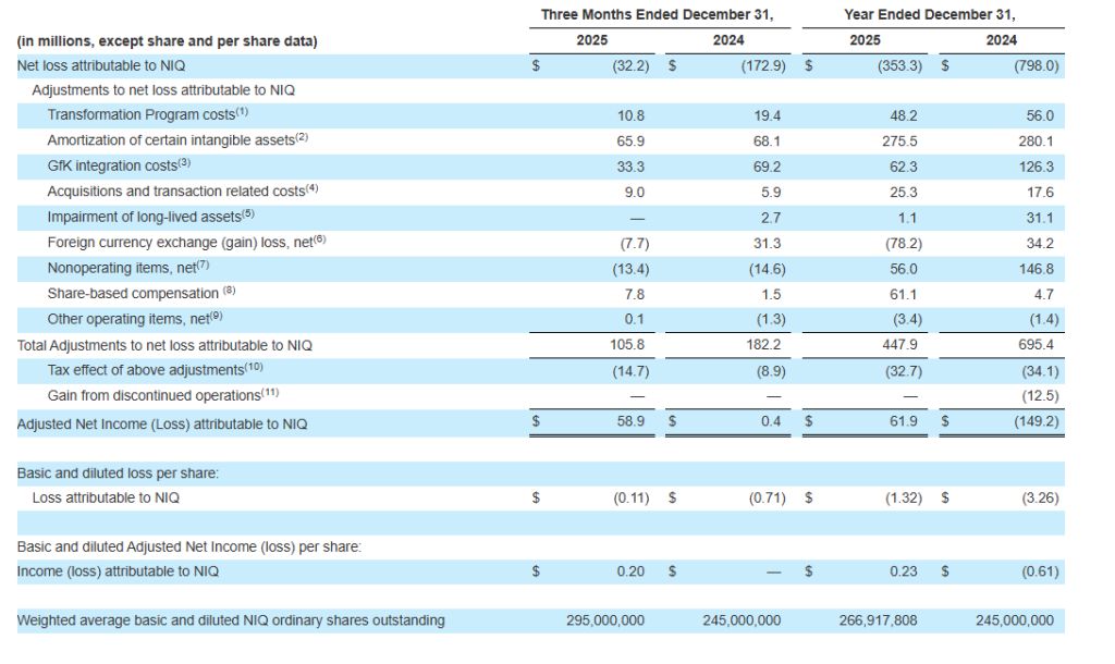 Adjusted Net Income (Loss) is defined as Net Loss Attributable to NIQ excluding special items deemed not to be reflective of ongoing or core operations. Adjusted Net Income (Loss) per Share is defined as Adjusted Net Income (Loss) divided by the Weighted Average Shares Outstanding.
