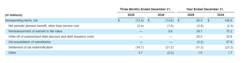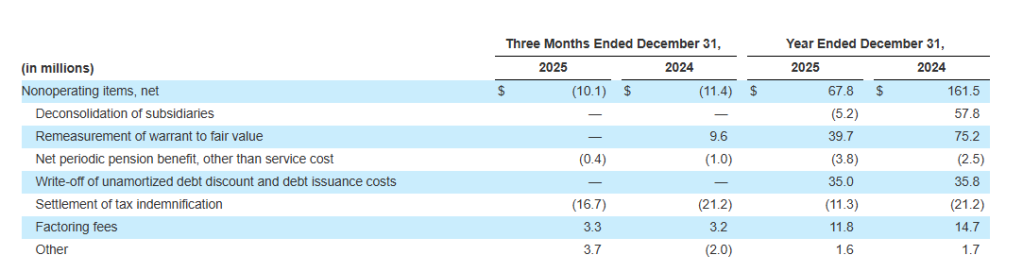 - Consists of adjustments related to: (i) net periodic pension costs other than service cost, (ii) remeasurement of warrant fair value prior to equity reclassification, (iii) factoring fees, (iv) write-off of unamortized debt discount and debt issuance costs, (v) deconsolidation of subsidiaries, (vi) settlement of tax indemnification and (vii) other nonoperating expenses.