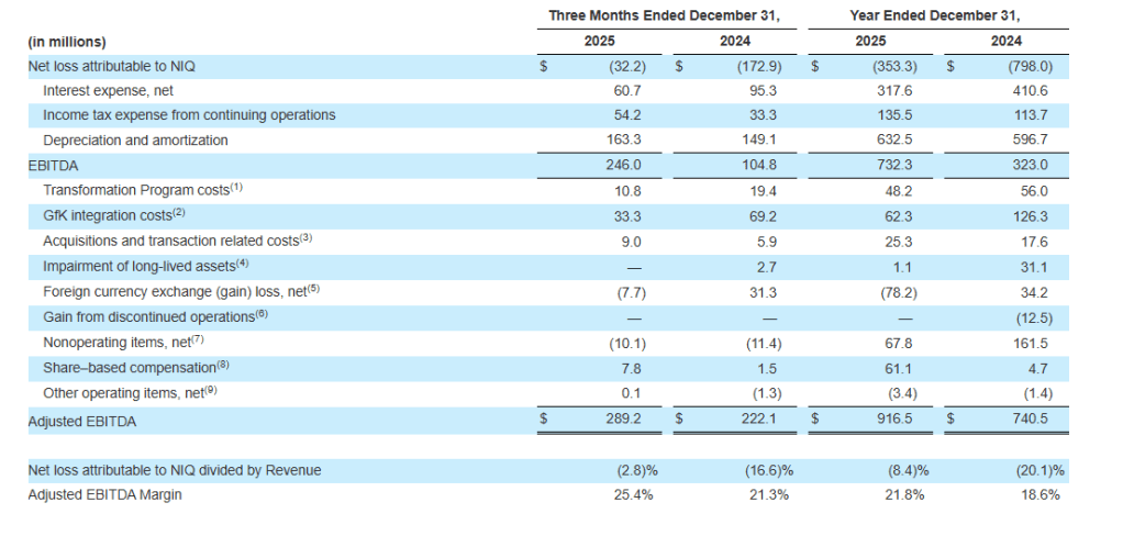 EBITDA is defined as net loss attributable to NIQ excluding interest expense, net, income tax expense from continuing operations and depreciation and amortization. Adjusted EBITDA is defined as EBITDA adjusted for Transformation Program costs, GfK integration costs, acquisition and transaction related costs, impairment of long-lived assets, foreign currency exchange (gain) loss, net, loss (gain) from discontinued operations, nonoperating items, net, share-based compensation expense, and other operating items, net. Specifically, Adjusted EBITDA allows for an assessment of our operating performance without the effect of charges that do not relate to the core operations of our business. Adjusted EBITDA Margin is calculated by dividing Adjusted EBITDA by Revenue. The following table shows EBITDA, and Adjusted EBITDA for the periods presented, and the reconciliation to their most comparable GAAP measure, Net Loss Attributable to NIQ, and Net Loss attributable to NIQ divided by Revenue, for the periods presented: