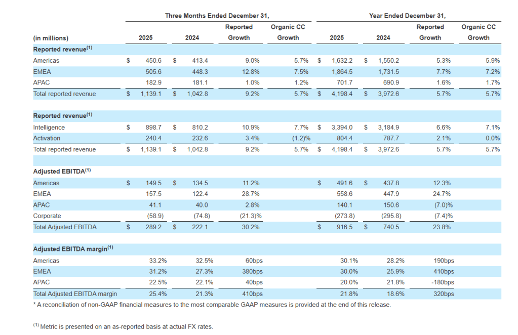 EMEA: Q4 segment revenue increased by $57.3 million, or 12.8% on an as-reported basis. Reported revenue growth was led by Intelligence, which rose 15.6% driven by strong renewals, expansion within core services, effective cross‑selling of new capabilities, and continued traction in adjacent and high‑growth markets. Activation decreased by 0.1% on an as-reported basis, driven by lower project demand and volume decreases. The sale of our ownership interest in Netquest reduced reported growth by 2.0%, while foreign‑currency movements added 7.3%. Organic constant currency growth was 7.5%.