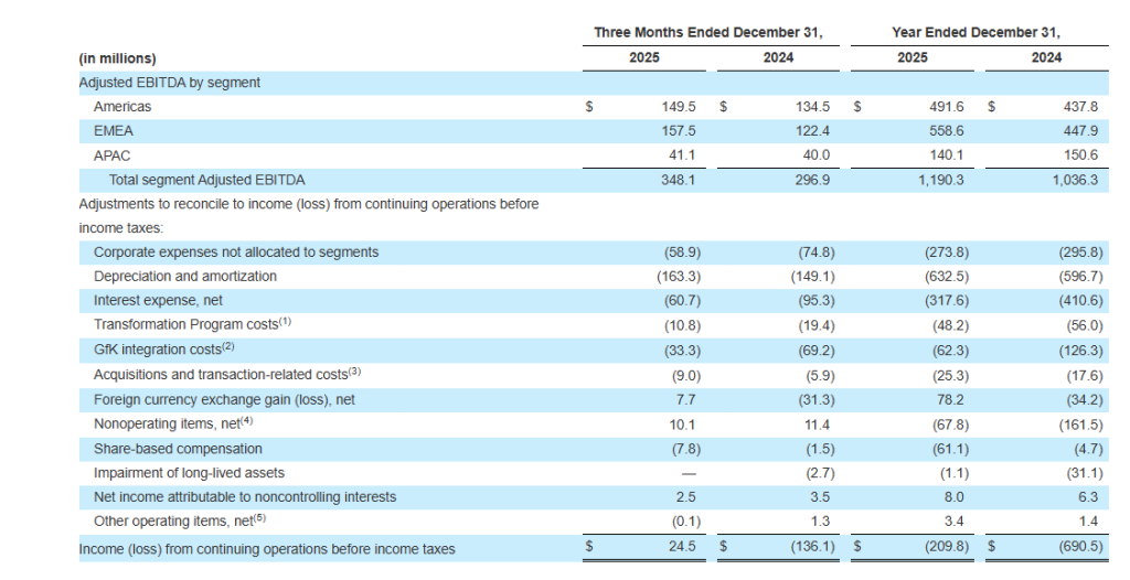 Cash flows provided by operating activities for the year ended December 31, 2025 were $298.7 million, compared to $73.9 million in 2024, primarily driven by higher profitability and our debt refinancings from July 2024, January 2025, and August 2025 offset by timing related to items in net working capital. Net working capital was impacted by temporarily higher DSOs related to the GfK integration and higher annual performance-based compensation driven by company over-performance in 2024. Capital expenditures for the year ended December 31, 2025 decreased to $262.9 million compared to $298.7 million in 2024 due to increased capital efficiency related to our new tech platform. Free cash flow for the year ended December 31, 2025 increased by $260.6 million, to $35.8 million compared to a $224.8 million deficit in 2024. Free cash flow for the three months ended December 31, 2025 increased by $114.9 million to $90.9 million compared to a deficit of $24.0 million in 2024 driven primarily by year-over-year increases in revenue flow-through to Adjusted EBITDA, increased capital efficiency, lower transformation costs, improved tax efficiency and lower interest expense as a result of our IPO and our debt refinancings from July 2024, January 2025, and August 2025, the last of which is outlined below in “Liquidity, Capital Resources & Recent Financings”.