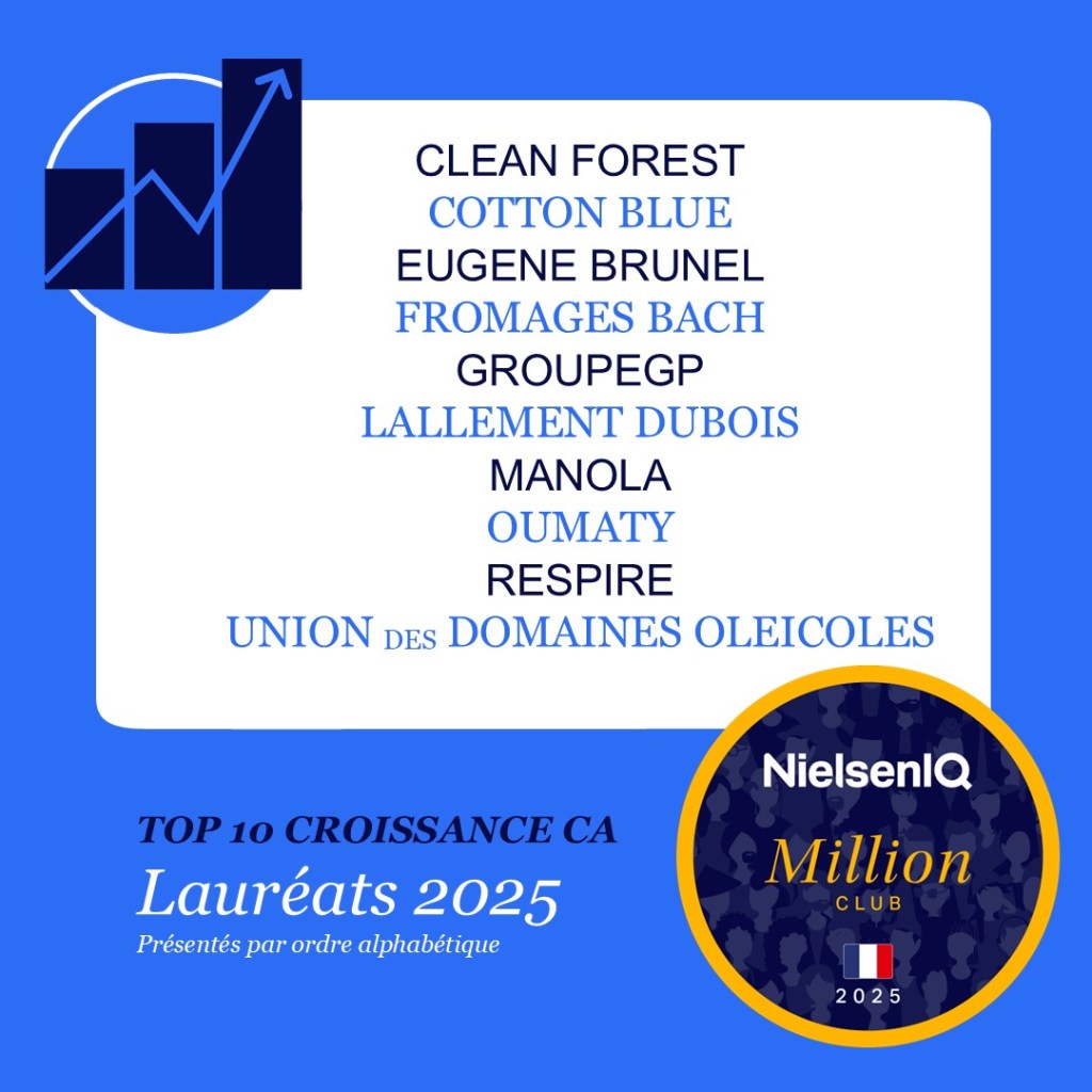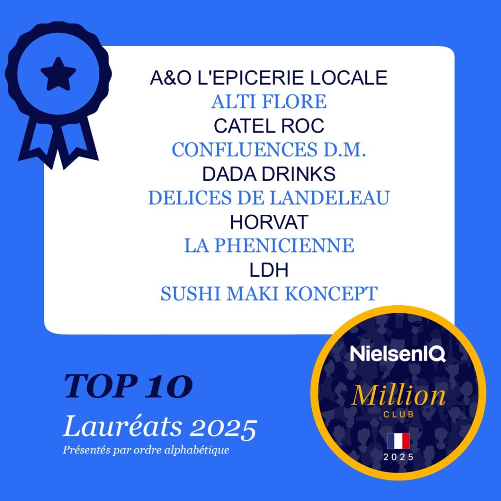 Les lauréats du Million Club sont définis par critères objectifs et authentifiés selon les données NielsenIQ Discover : CA arrêté fin décembre 2024 compris entre 1 et 3 millions d’euros TTC en sorties caisses, réalisé en Grande Distribution tous rayons confondus (HMSM, Drive, Proxi, SDMP) par une Marque propriétaire détenue par une TPE/PME basée en France, et vendant des produits de Grande consommation et Frais Libre-Service (EAN en poids fixe).