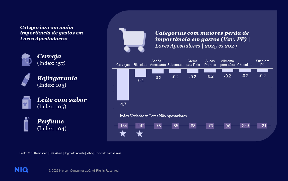 Apostas são novo competidor em Share of Wallet do consumidor: Lares apostadores apresentam maior comprometimento com dívidas e eventos sociais, e uma leve perda de priorização de FMCG. Isso pressiona fabricantes a competir com um “novo shopper journey paralelo” que captura atenção e renda.