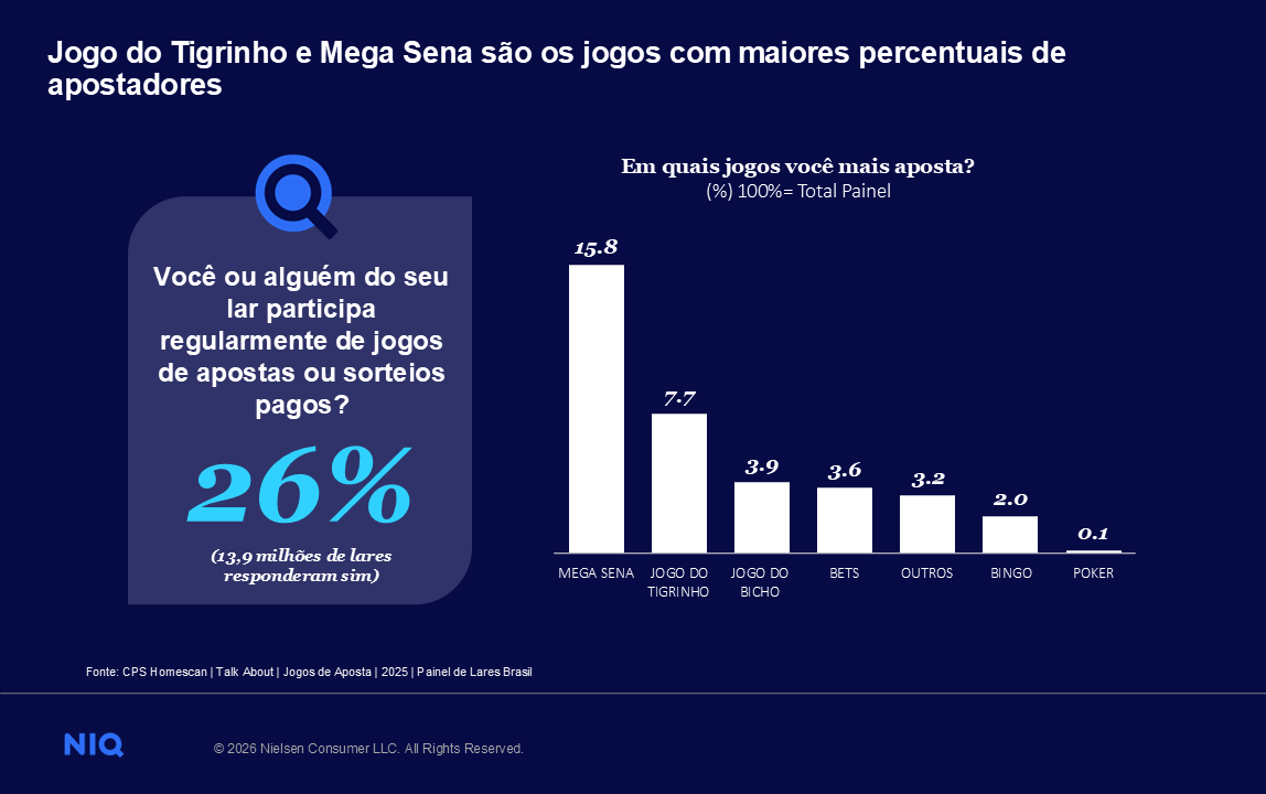 Estudo inédito da NielsenIQ Brasil revelou que 26,3% dos domicílios fizeram algum tipo de aposta no ano, mostrando que as bets ganharam espaço nos gastos dos lares em 2025. Entre esses lares, 49% enxergam a prática como uma forma de obter renda extra.