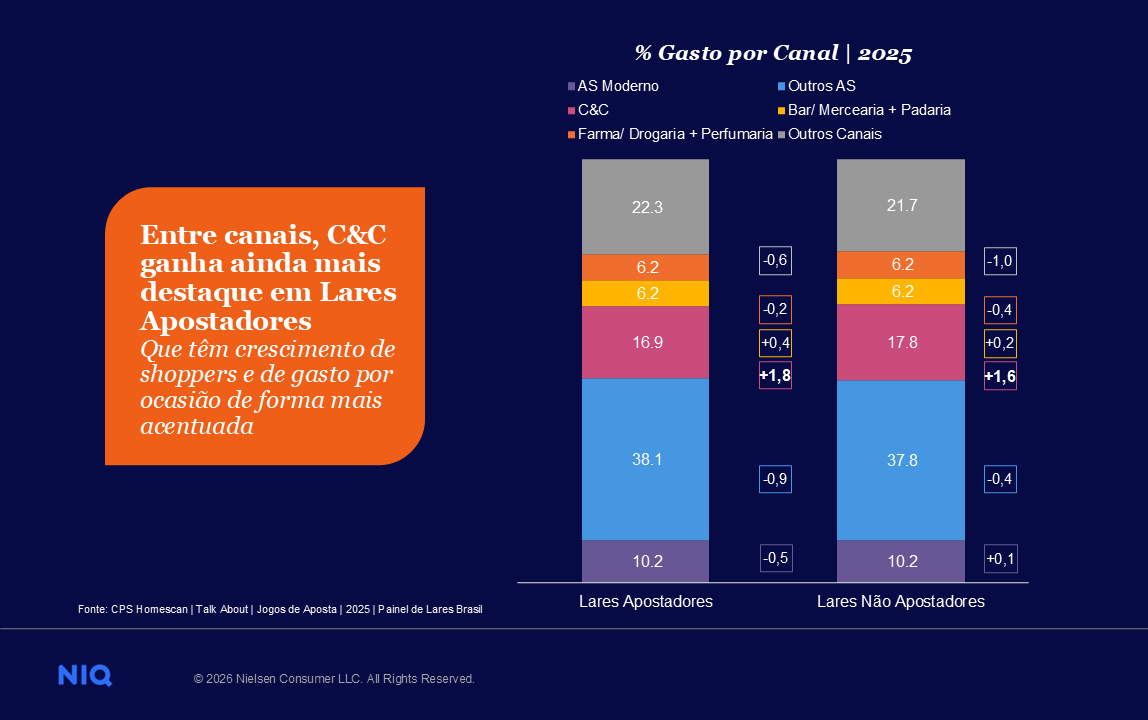 Categorias relacionadas a indulgências são as mais impactadas nos lares apostadores. Embora importantes dentro do orçamento doméstico, são também as que mais sofrem substituição de gastos. A cerveja, por exemplo, registra a maior retração na cesta, com queda de participação dos gastos -1,7pp. Em seguida vêm os biscoitos, que diminuíram -0,4pp. Refrigerantes e perfumes também apresentam impactos semelhantes. O canal que mais se destacou foi o Cash & Carry, tanto entre lares apostadores quanto entre não apostadores. No primeiro grupo, o canal cresceu 1,8pp; no segundo, 1,6pp, em 2025.