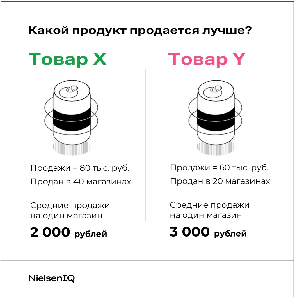 Если представить, что существует два бренда в категории, Х (зеленый) и Y (розовый), и продажи бренда X выше, чем продажи бренда Y, а их представленность отличается, то чтобы ответить на вопрос «какой продукт продается лучше?», можно проанализировать фактор спроса и рассчитать отношение продаж к количеству магазинов.